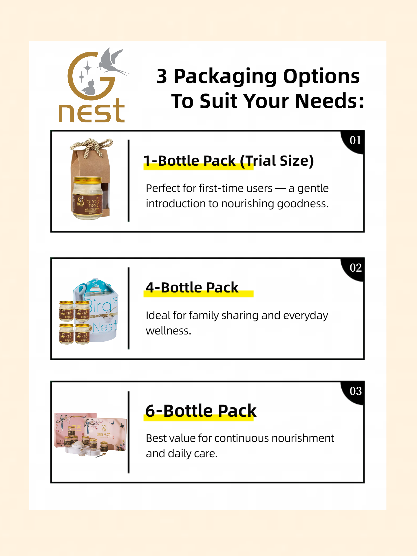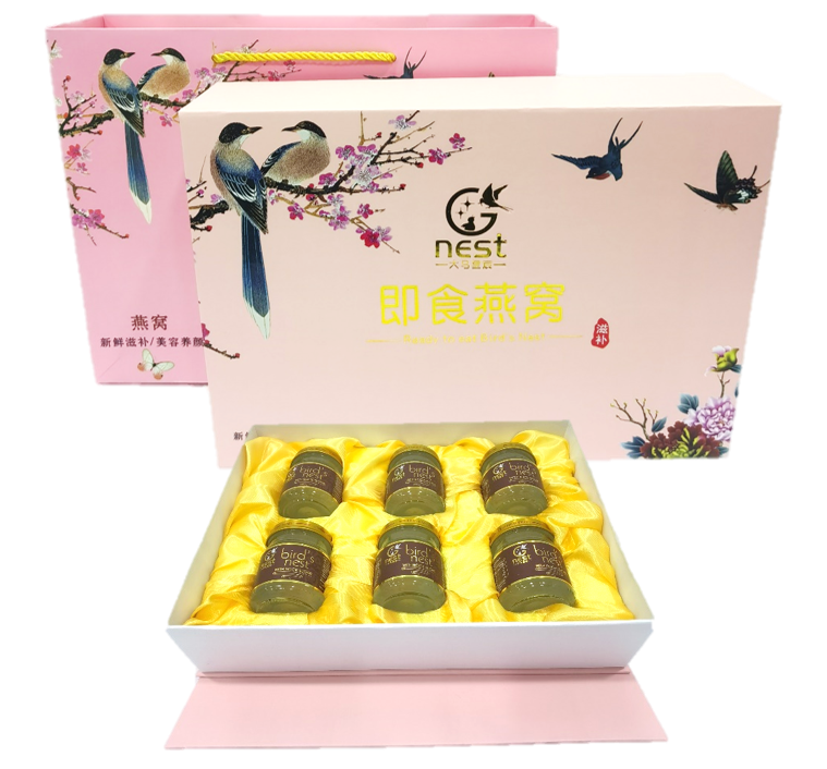 1) 6 bottle Original pure Bird Nest Drink with little Rock Sugar. Not sweet, suit for all type people.