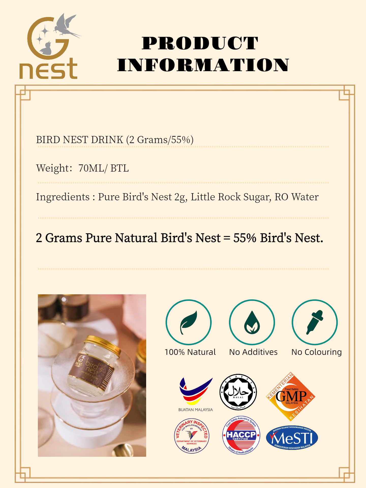 2)每瓶燕窝含量 2克纯天然干燕窝, 55%燕窝固体物